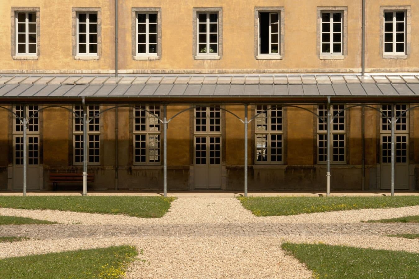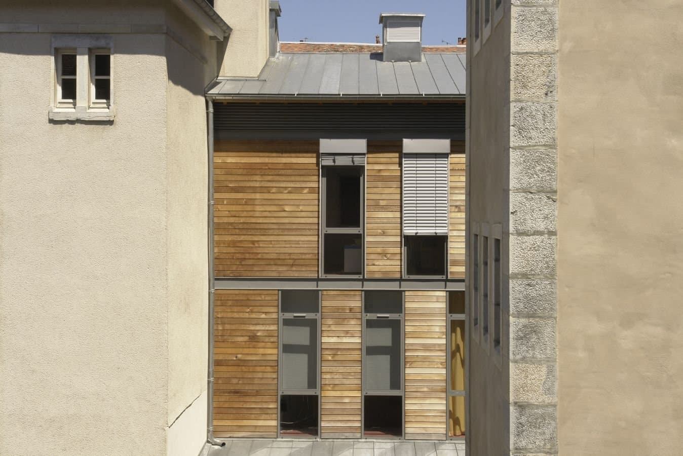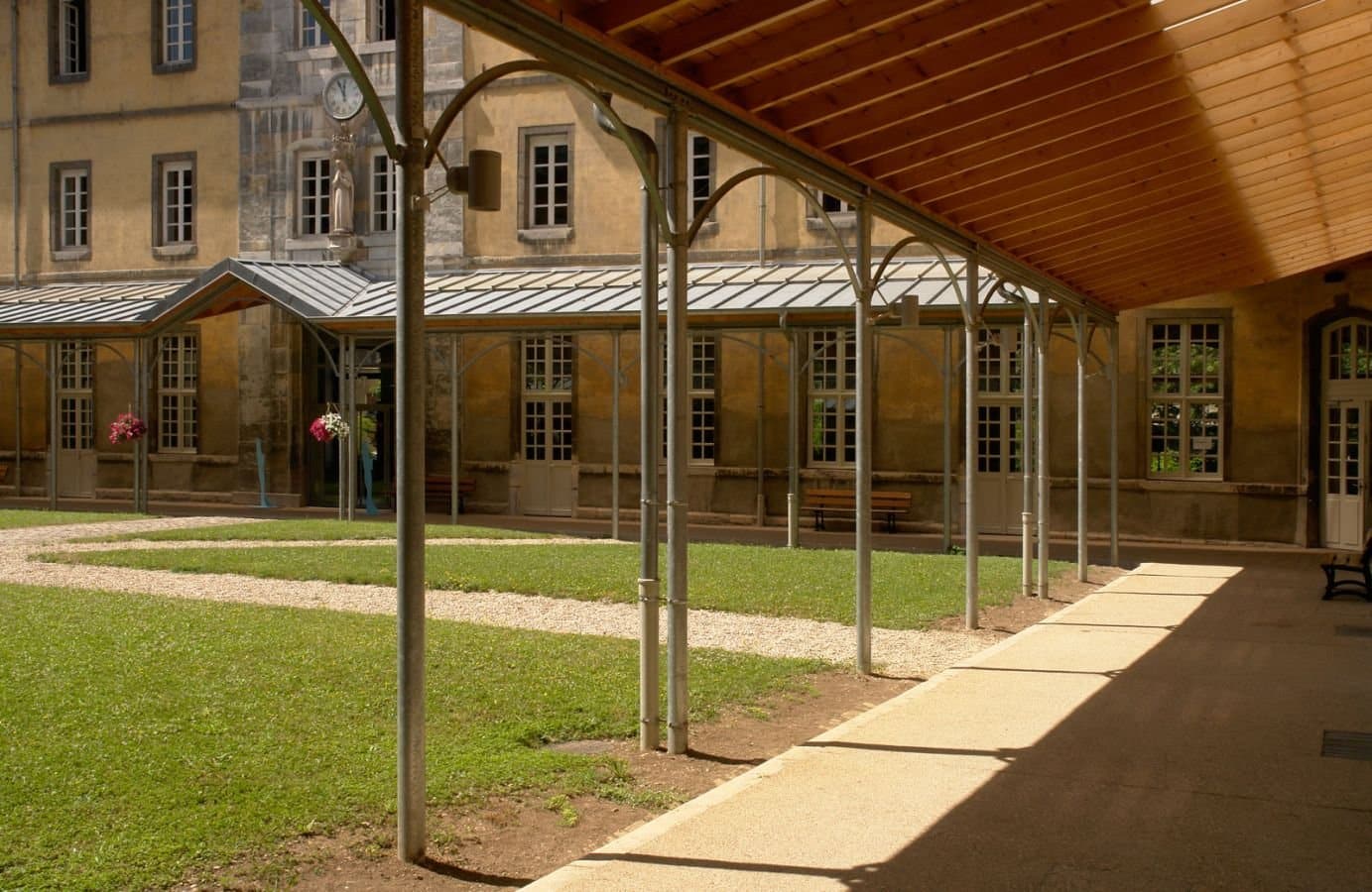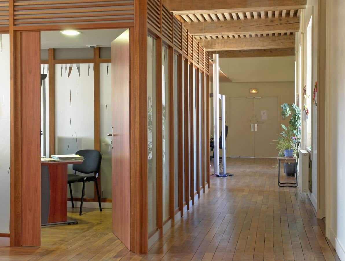 Simplicité, sérénité sont les maîtres mots qui nous ont accompagnés tout au long du projet : Coursives couvertes en métal + zinc proposent une distribution extérieure des espaces de réception, jardins-promenades redessinés, mise à nu des structures (plafond à la française), confort intérieur des locaux de travail (thermique et acoustique).
