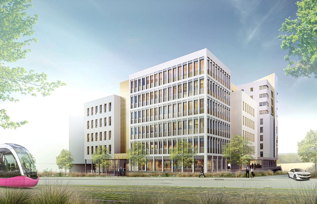 Construction de 2 bâtiments ayant un socle de parking commun. L’une des constructions (R+4+attique) accueille des activités tertiaires et l’autre (R+9) un hôtel.
