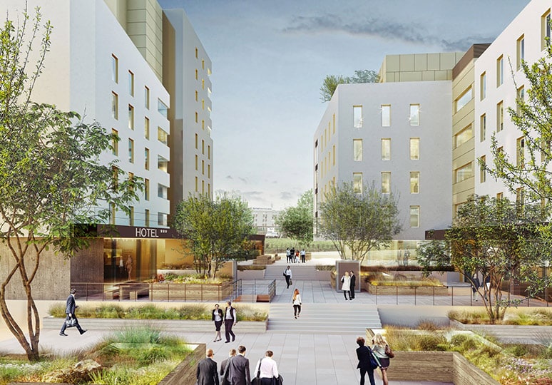 L’ensemble est constitué autour d’un cœur d’ilot paysagé qui dessert une partie des entrées, organisant cette esplanade minérale et végétale et créant des lieux de terrasses protégées pour les usagers.