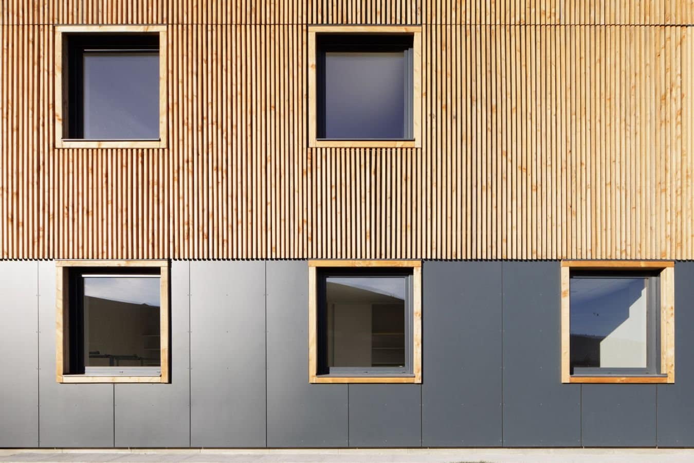 - Mise en œuvre d’une « façade manteau » à ossature bois préfabriquée à forte isolation thermique + châssis bois/alu + vitrages performants.