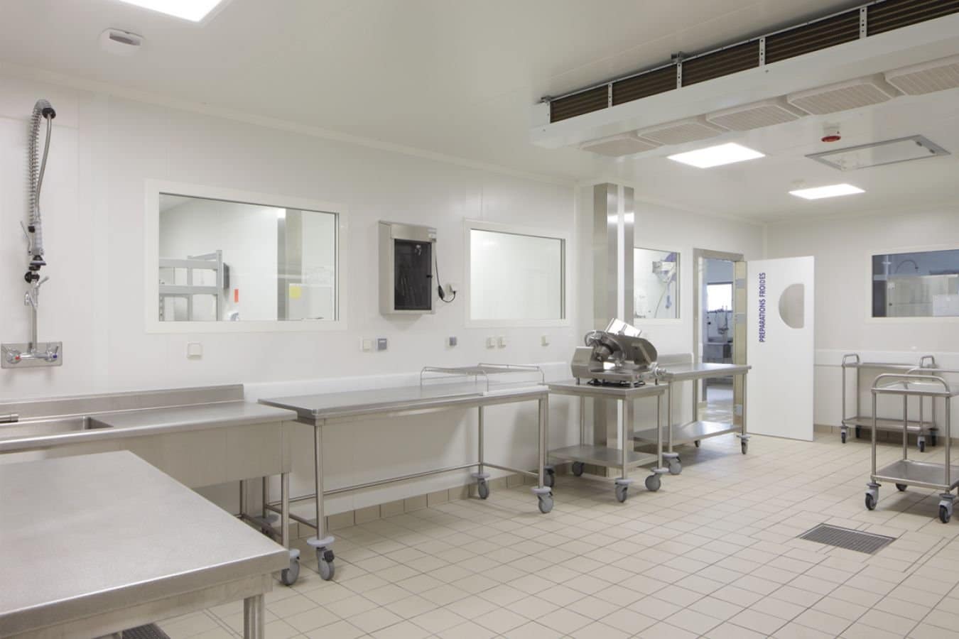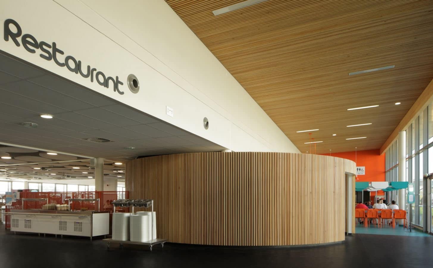 La nouvelle construction propose un jeu d’ombres et de lumières (façade vitrée offrant des transparences jusqu’au cœur de la salle principale). Des espaces fluides et transparents offrent des lieux de convivialité en respectant la chaine de distribution des repas.