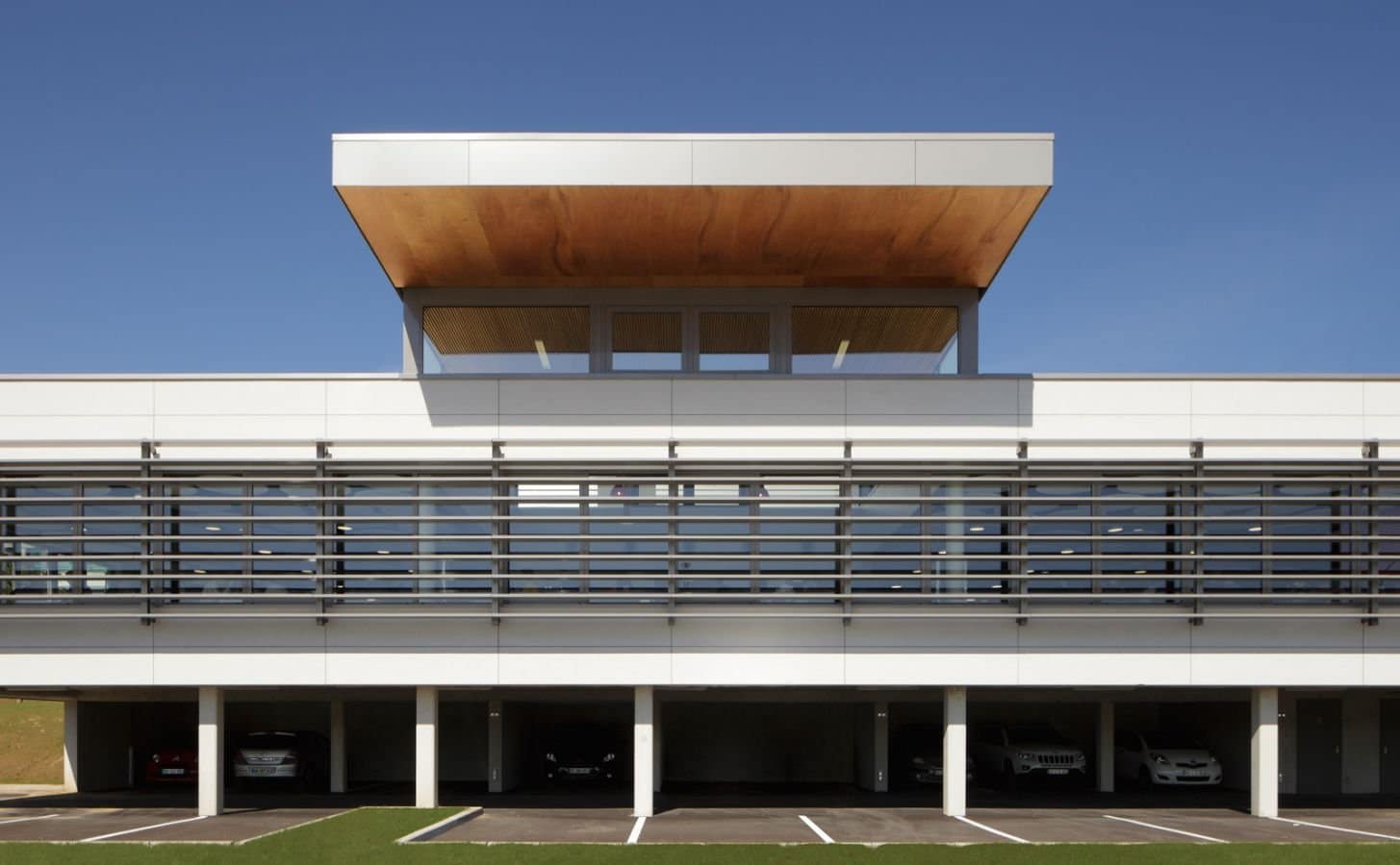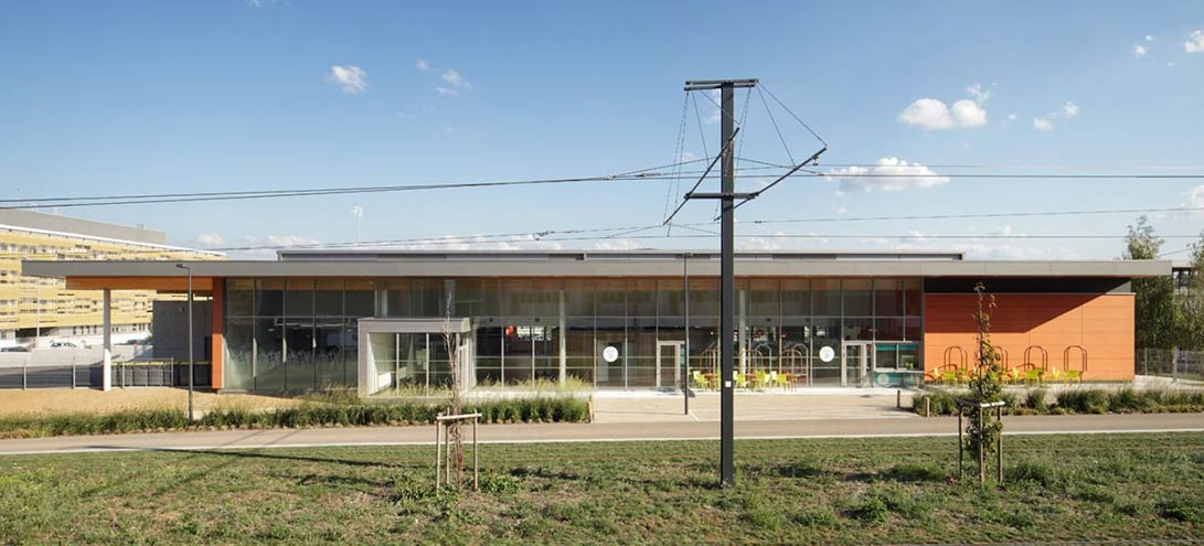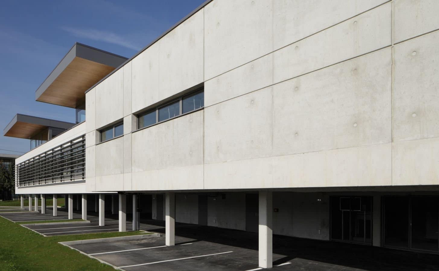 Le bâtiment est construit sur un niveau pour une parfaite fonctionnalité et repose sur une dalle sur pilotis qui génère des places de parking. A partir de cette dalle une structure légère (système constructif poteau/poutre BA + charpente bois) offre de grands espaces avec souplesse d’aménagement pour une évolutivité future.