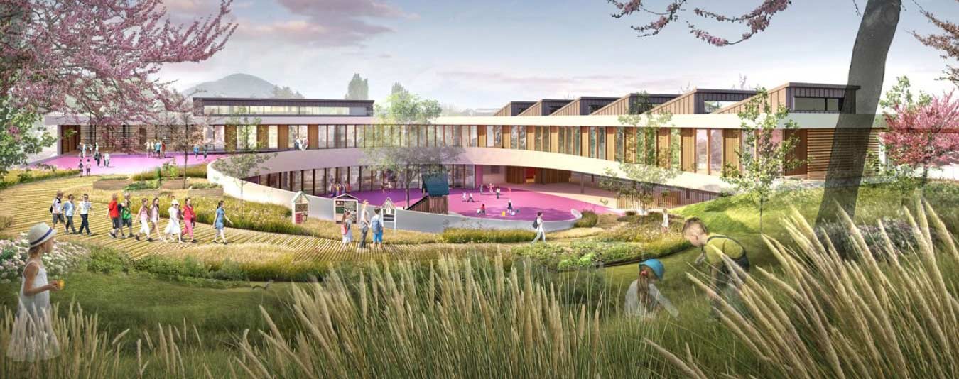 Coté colline : Les espaces extérieurs sont des lieux privilégiés, à la fois ouverts sur les plus beaux espaces végétalisés et sur le grand paysage de la colline ; ils sont de véritables lieux d’interaction des enfants avec leur environnement. La nature est amenée au cœur de l’établissement à travers la promenade, les jardins pédagogiques, le patio et les cours.