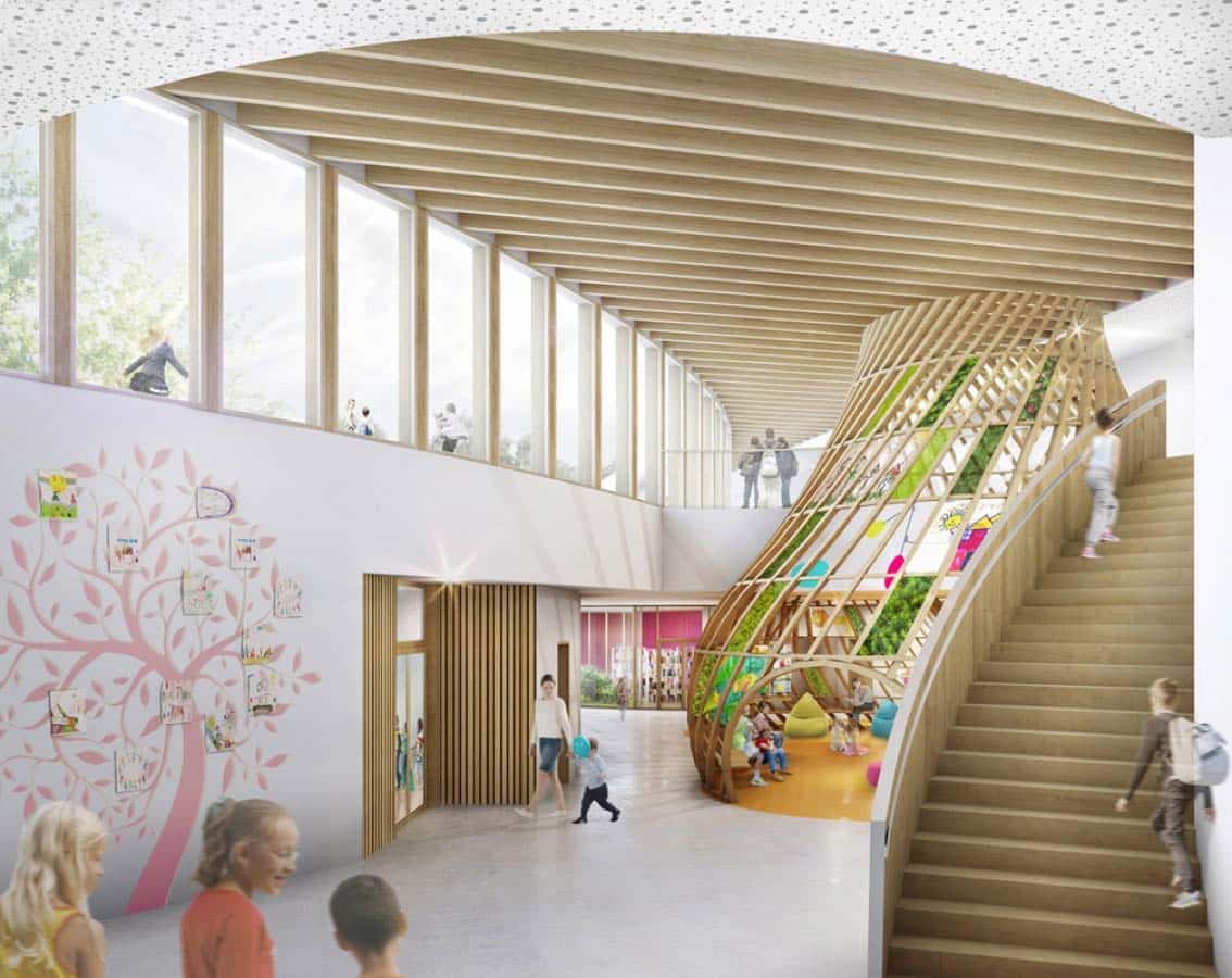 Dès l’entrée, les formes douces et courbes de l’école contrastent avec la rigueur et la radicalité des lignes extérieures. Les volumes ludiques tout en rondeur minimisent les angles, reprennent le concept de nid et créent une ambiance protectrice et accueillante.